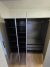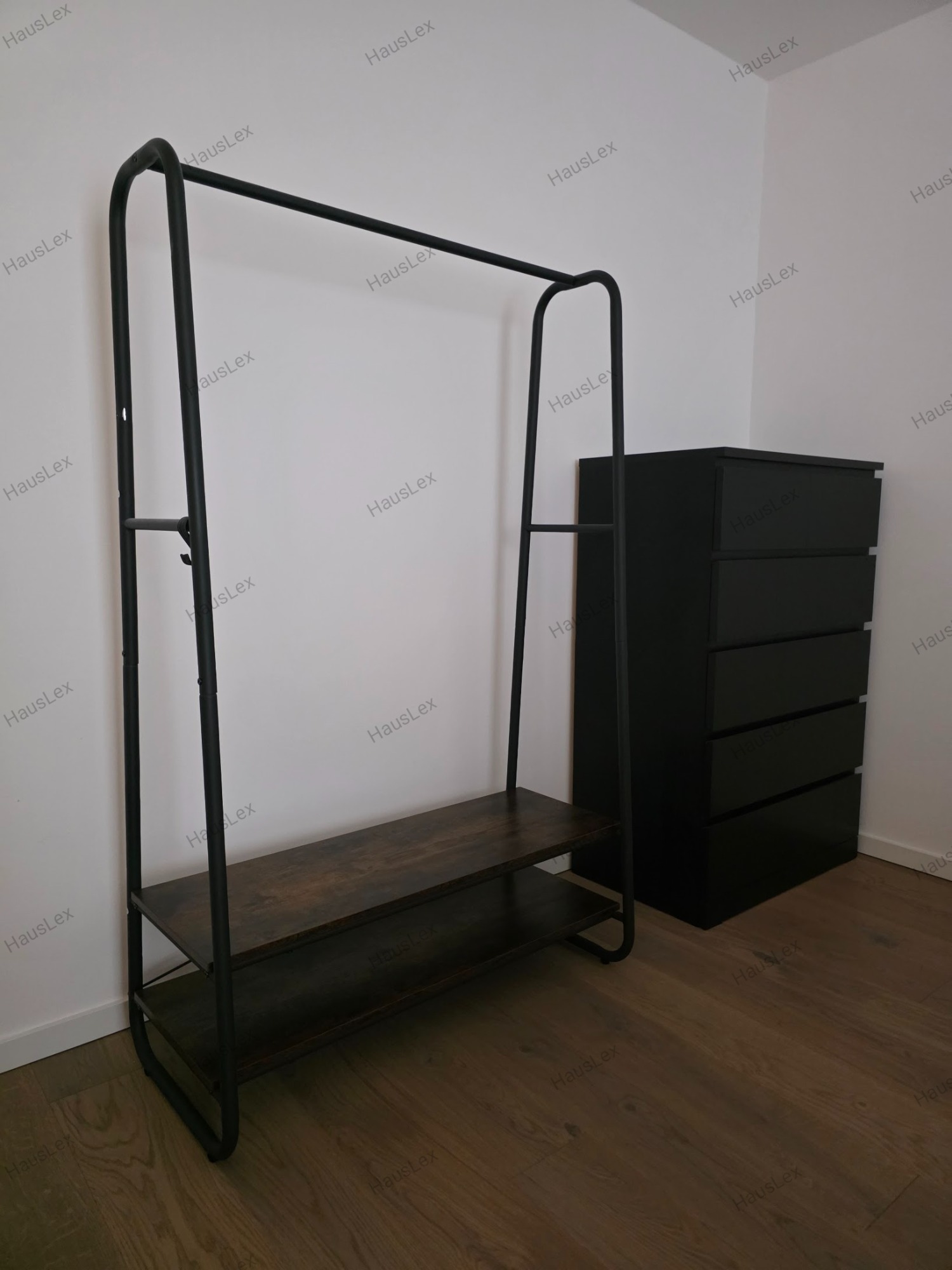 Stabil montiertes Garderobensystem und schwarze IKEA Kommode mit sechs Schubladen.
