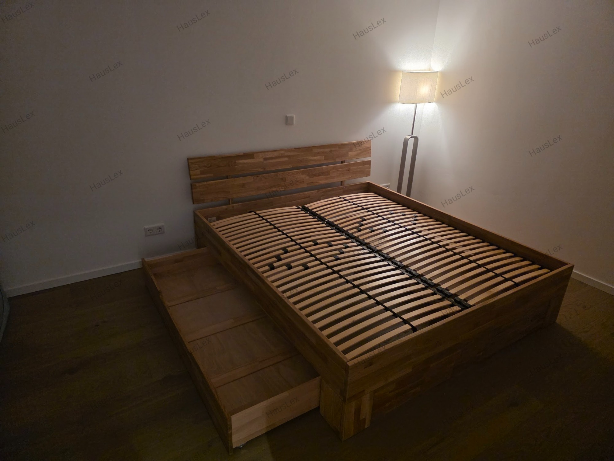 Massivholzbett mit integrierten Schubladen - präzise montiert und zusätzlich verstärkt.